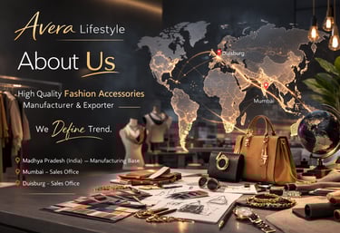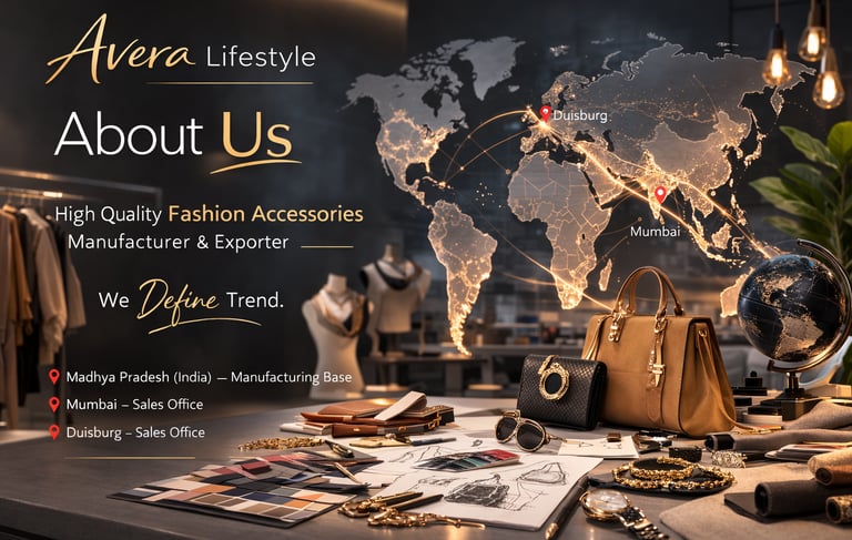 Avera Lifestyle is a modern fashion accessories manufacturer and exporter dedicated to creating high-quality products that reflect the latest global trends. With our manufacturing base in Madhya Pradesh, India, and sales offices in Mumbai and Dusseldorf (Germany), we combine strong production capabilities with an international market presence.